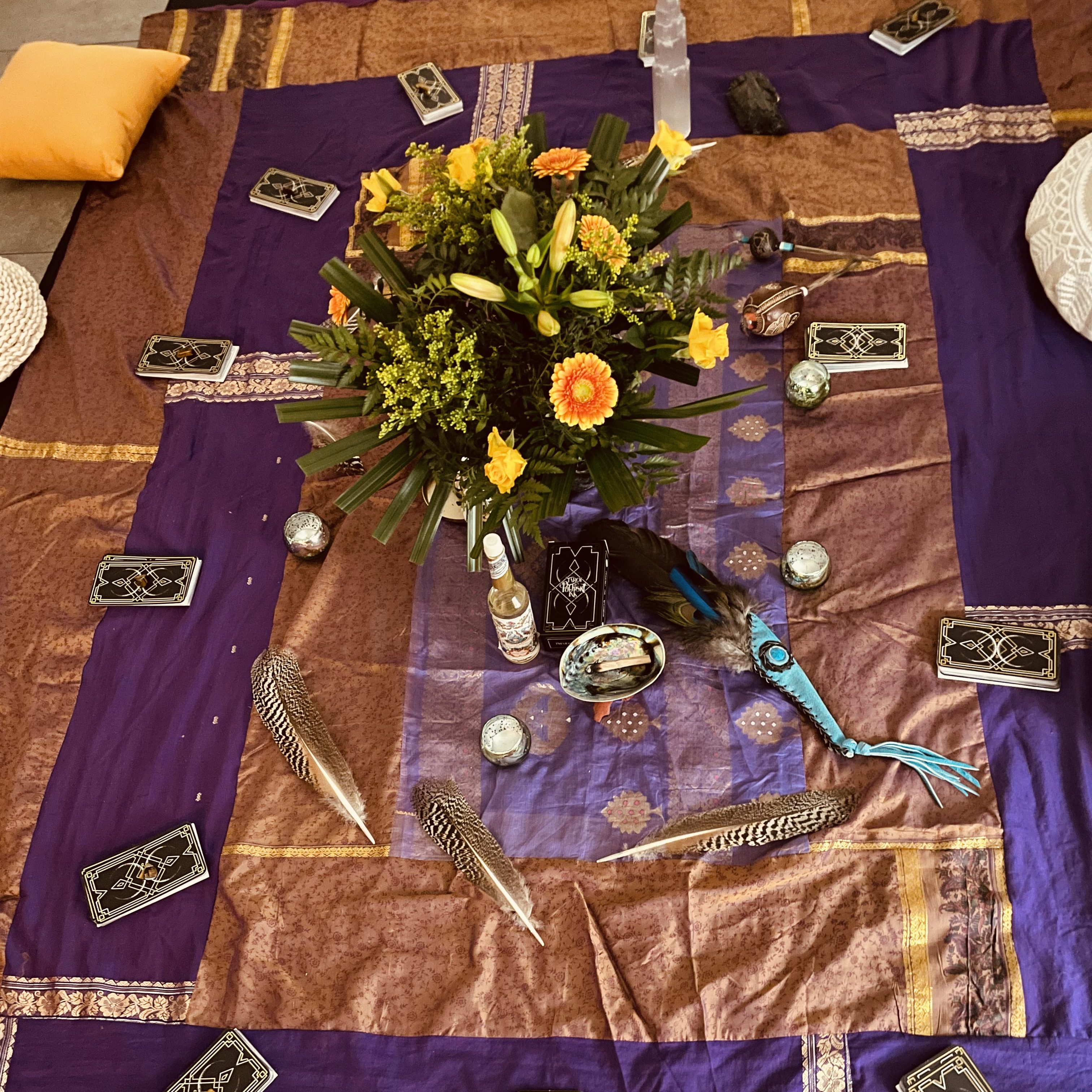 - Cercle de paroles et de partages : Nous vous proposons ici un espace sécurisé pour vous exprimer et vous écouter sur vos ressentis lors de l’atelier. Ce moment de partage permet l’intégration et la compréhensions des énergies et du tirage, dans un espace bienveillant, permettant de grandir ensemble.